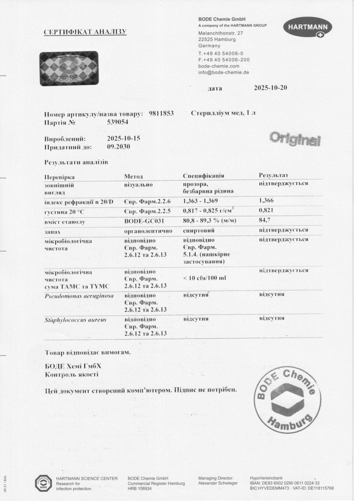 • атестований відповідно до Європейських стандартів EN 1500, EN 12791, EN 13727, EN 14348, EN 1362, EN 14476, EN 12791.