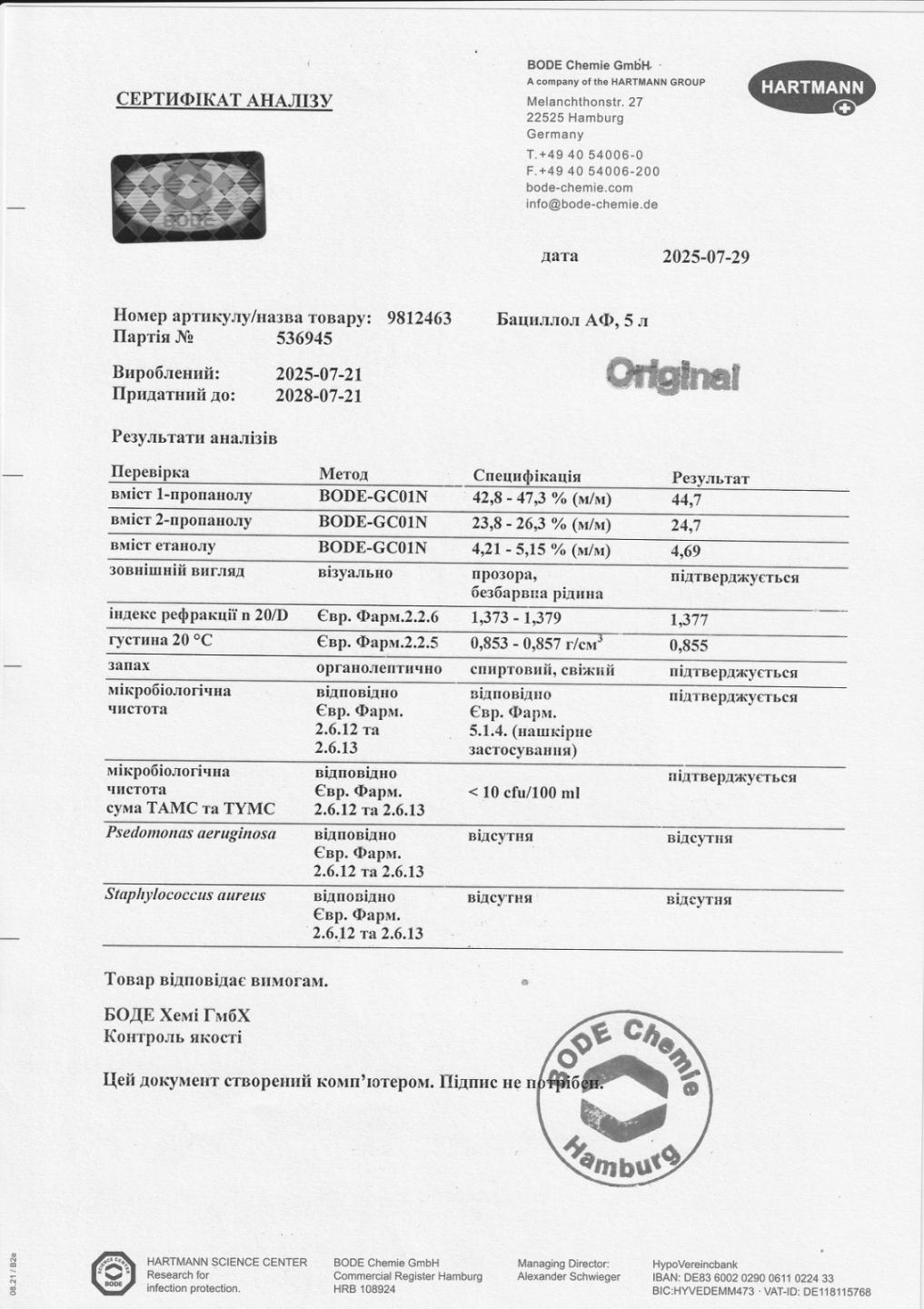 Состав: 100 г раствора содержат: 1-пропанол - 45,0 г; 2-пропанол - 25,0 г; этанол - 4,7 г; 2-бутанон - <1.0 г; воду очищенную.