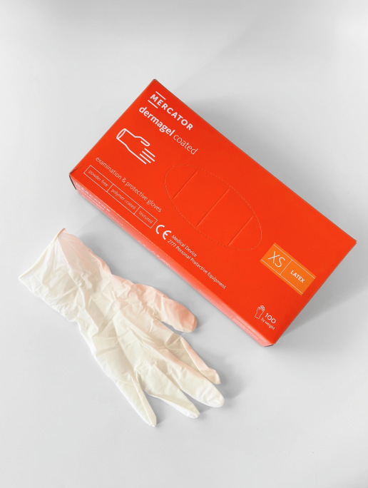Перчатки латексные без пудры (размер XS) 5,5г/м² MERCATOR Dermagel Coated, 100шт купить, цена в Киеве - chila.ua