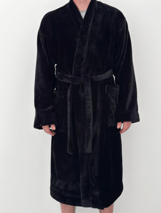 Стильный халат с шалевым воротником изготовлен из материала велсофт (Wellsoft), который часто называют плюшем или искусственной махрой. Эта высококачественная ткань (100% полиэстер) состоит из тончайших волокон с минимальным диаметром 0,06 мм. Тонкие нити сплетены в материал, имеющий множество воздушных пустот, благодаря чему велсофт получается таким воздушным и мягким.